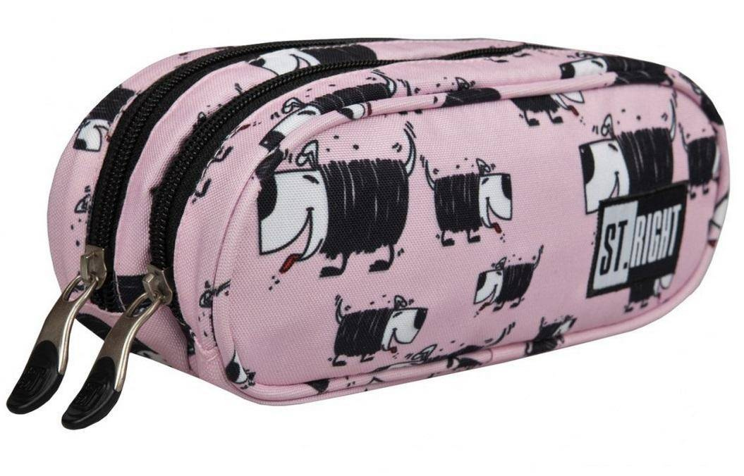 Pojemny i funkcjonalny piórnik dwukomorowy. Charakteryzuje się bardzo starannym wykonaniem oraz pięknym wzorem w zabawne pieski na pastelowym tle. Piórnik uszyto z wytrzymałego i wodoodpornego materiału. Dwie oddzielne komory pomieszczą wszystkie potrzebne akcesoria. Komory zamykane są na suwaki, zakończone dużymi poręcznymi pullerami. Piórnik jest doskonałym uzupełnieniem do plecaka St.Right dostępnego w tej samej wersji kolorystycznej.