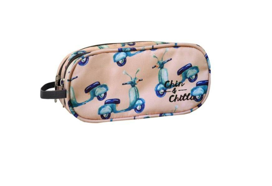 Piórnik w kolorze pudrowym z motywem skuterów.