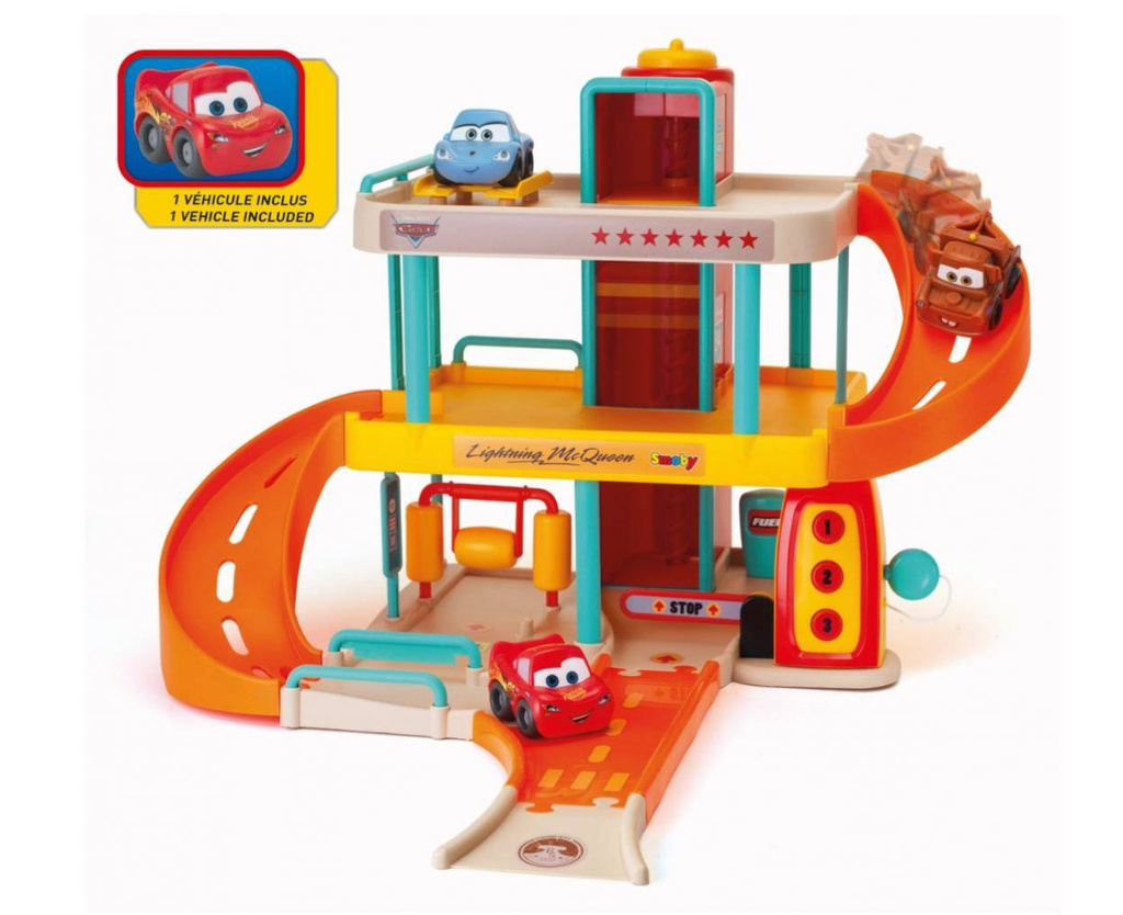 Elektroniczny duży garaż z 3 poziomami do zabawy m.in. myjnia samochodowa, winda, rampa, elektroniczna brama, dystrybutor oraz 1 pojazd Zygzaka McQueena. Dziecko może otwierać i zamykać szlaban za pomocą specjalnego klucza. Wymiary: 53x43x40cm, 18m+